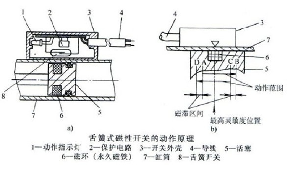 將舌簧開關(guān)成型于合成樹脂塊內(nèi),帶有磁環(huán)的氣缸活塞向右運動到A位置,舌簧開關(guān)進入磁場內(nèi),兩簧片被磁化而相互吸引,觸點閉合,發(fā)出一電信號;活塞運動到B位置時,舌簧開關(guān)離開磁場,簧片失磁,觸點自動脫開。A-B區(qū)間稱為磁性開關(guān)的動作范圍?;钊蜃蠓聪蜻\動時,動作范圍是C-D區(qū)間。有觸點式磁性開關(guān)的動作范圍一般在5-14mm。B-C區(qū)間和D-A區(qū)間稱為磁滯區(qū)間,此區(qū)間通常小于2mm。扣除磁滯區(qū)間的動作范圍為最適合安裝位置,其中間位置稱為最高靈敏度位置。若磁環(huán)停止在磁滯位置,則開關(guān)動作不穩(wěn)定,易受外界干擾。